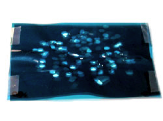 This one was created by using a hole punch to randomly remove bits of color from two gels- G710 Blue Green and G780 Shark Blue, and then taping the two colors directly over each other.
