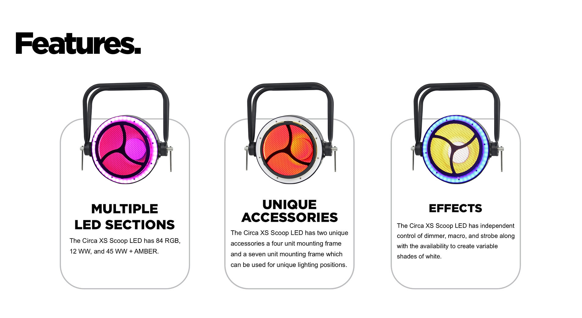 MEGA-Lite presents a new addition to the Circa Scoop LED Series. This is a smaller next-level unit designed with different elements that can be used in multiple applications. It features a variety of technological components that add a one of a kind look to any concert, church, theater or club.