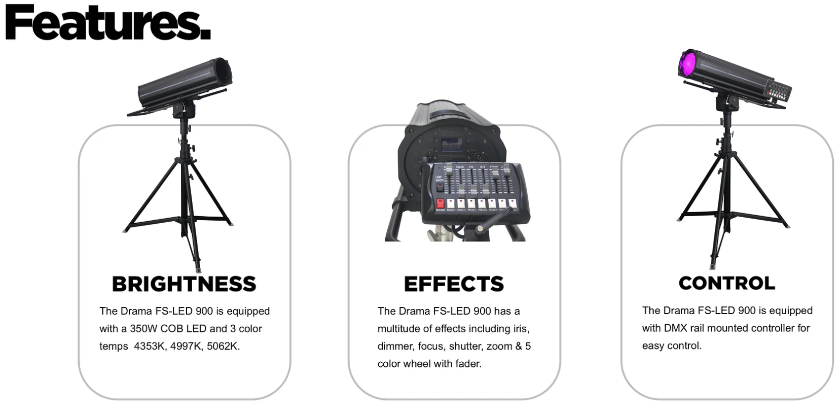 The Drama FS-LED 900 is an extremely powerful follow spot LED fixture. Faders and buttons are located on the included DMX controller. The unit has a color wheel that produces a red, green, yellow, blue, orange and white spotlight.