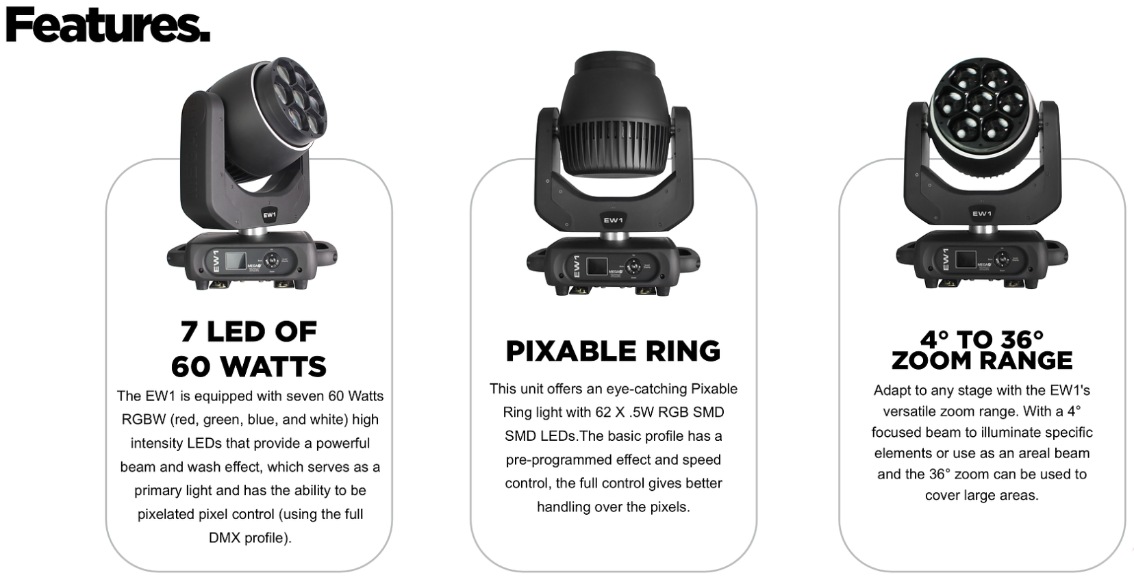 With its beam-to-wash element, the EWI luminaire is designed for adaptability, allowing it to be used as a beam or wash. Its outer ring adds another element of depth to the fixture, giving you the flexibility to create unique lighting effects for any event.